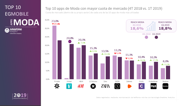EL Estudio General Mobile, EGMobile®, elaborado por Smartme Analytics, empresa pionera en el uso de Tecnología Observacional ha conseguido ofrecer por primera vez en España, datos de posicionamiento y cuota de mercado en España de las principales apps de moda que consumen los ciudadanos españoles. Así: Privalia, Vinted, H&M. 21 Buttons, Zara, Shein, Zalando, Chicfy, Pull and Bear y Bershka se posicionan como las 10 primeras de ranking. A ellas les siguen: Stradivarius, Vente-privee, Showroom, Primor y Asos, entre otras.