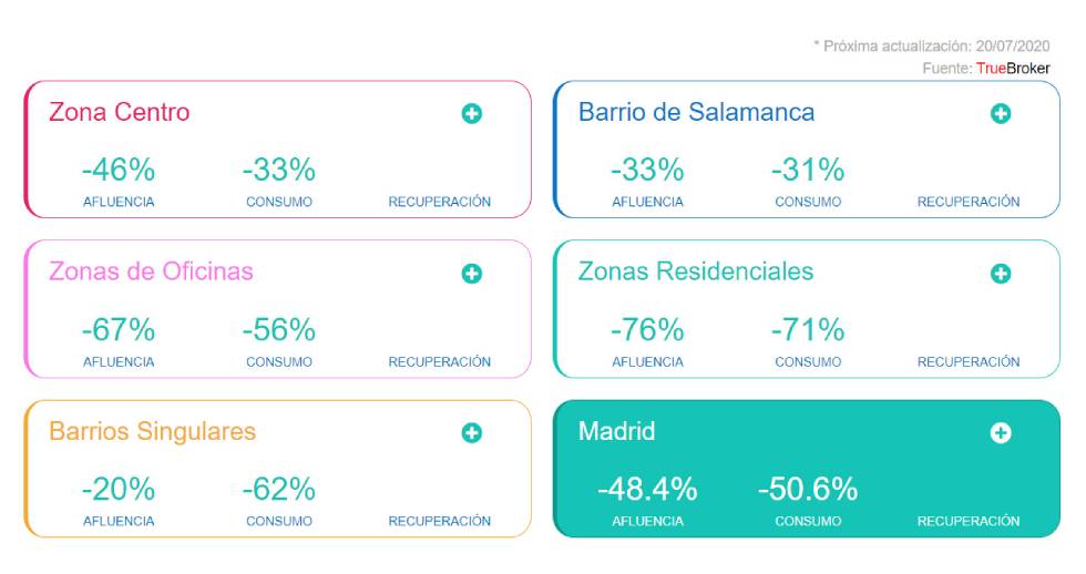 Según la primera entrega del iTB, a fecha del 20 de junio pasado y en comparación con los datos anteriores a la pandemia, la afluencia de público había bajado un 53% y la de consumo un 62% en la Zona Centro de la capital, un 49% y un 44% en el barrio de Salamanca, un 78% y un 77% en las zonas residenciales, y un 72%, en público y en consumidores en las zonas de oficinas. Paradójicamente, en los barrios Singulares la afluencia de público cayó sólo un 24%, mientras que la de consumidores bajo un 81%.